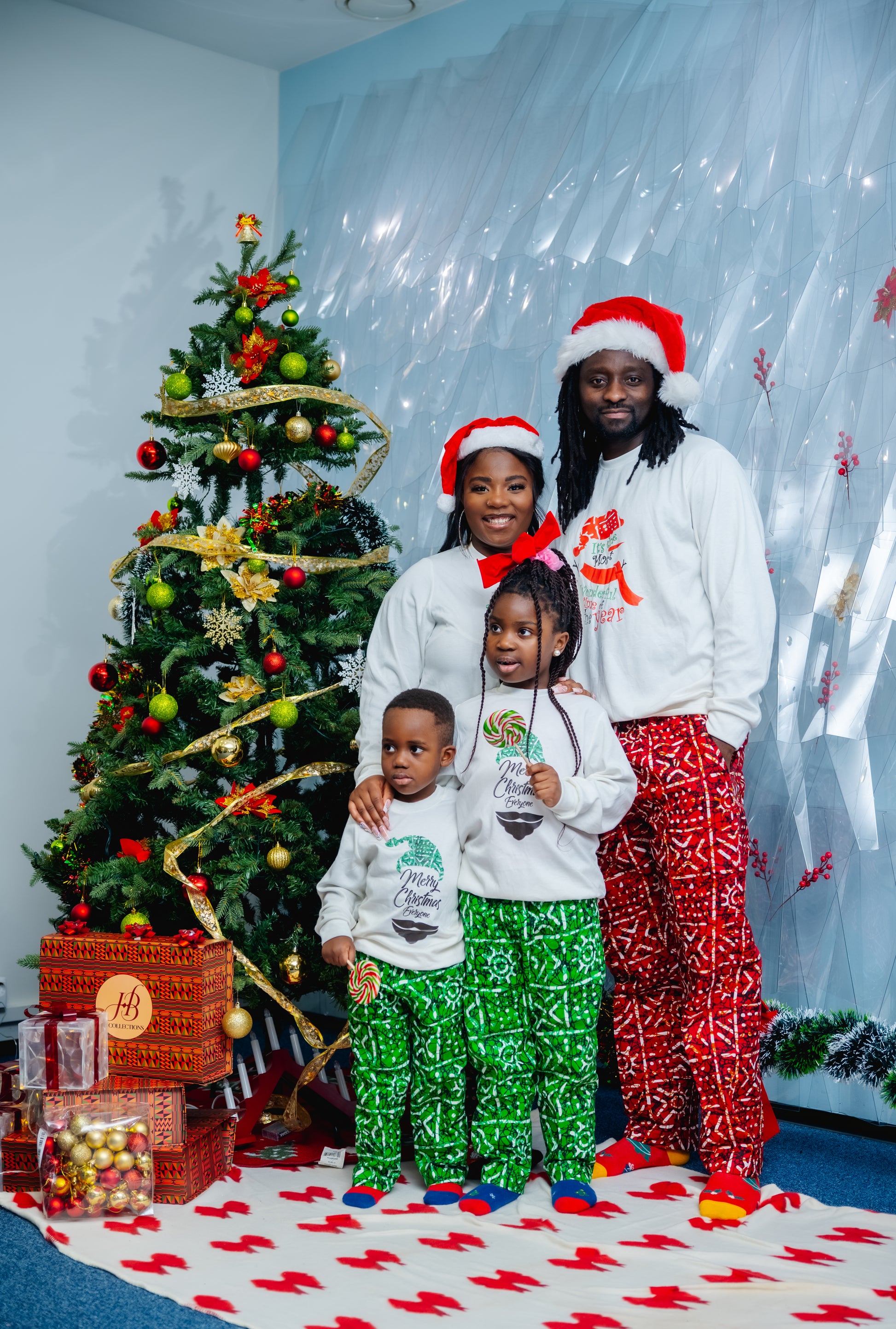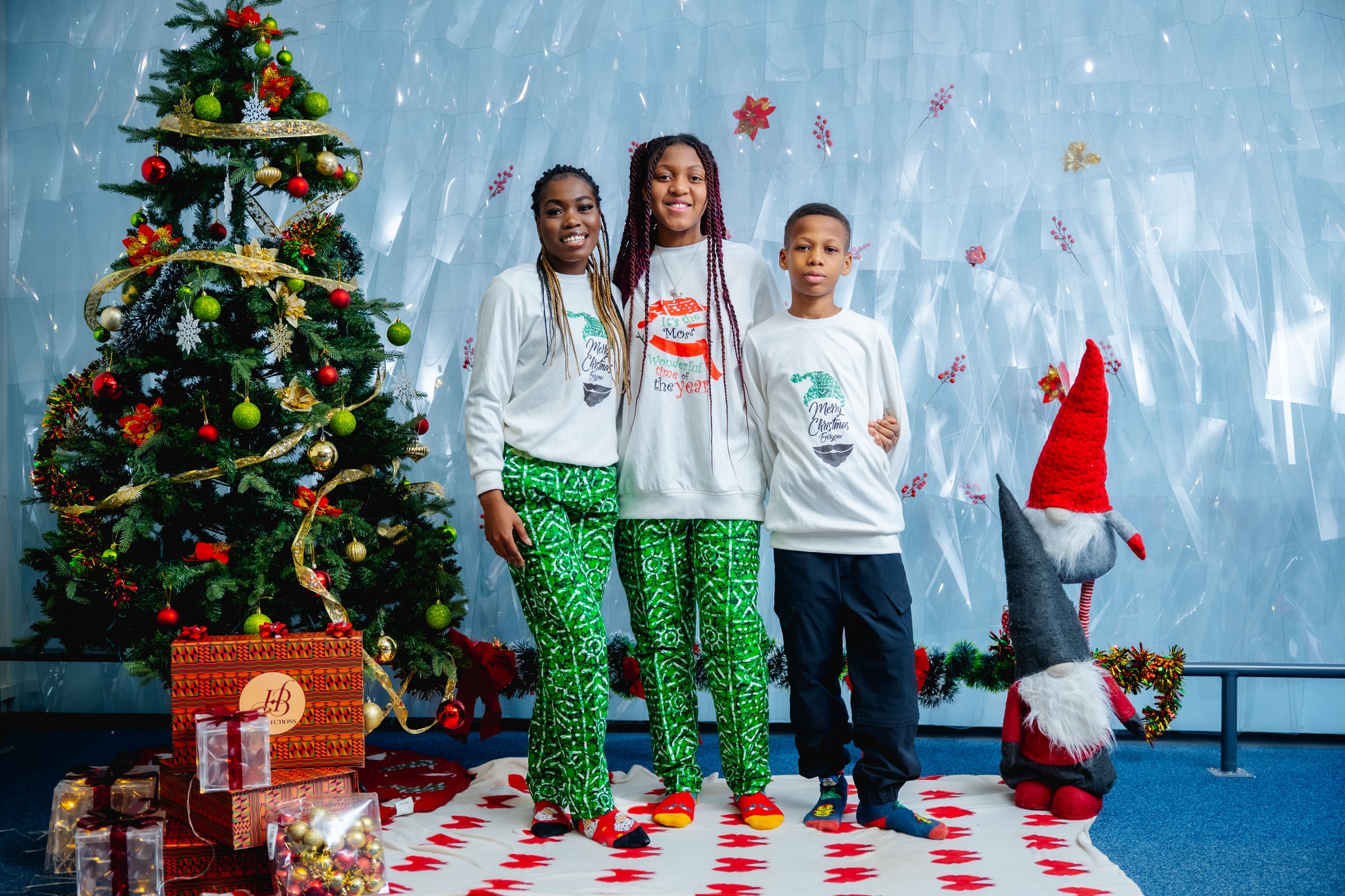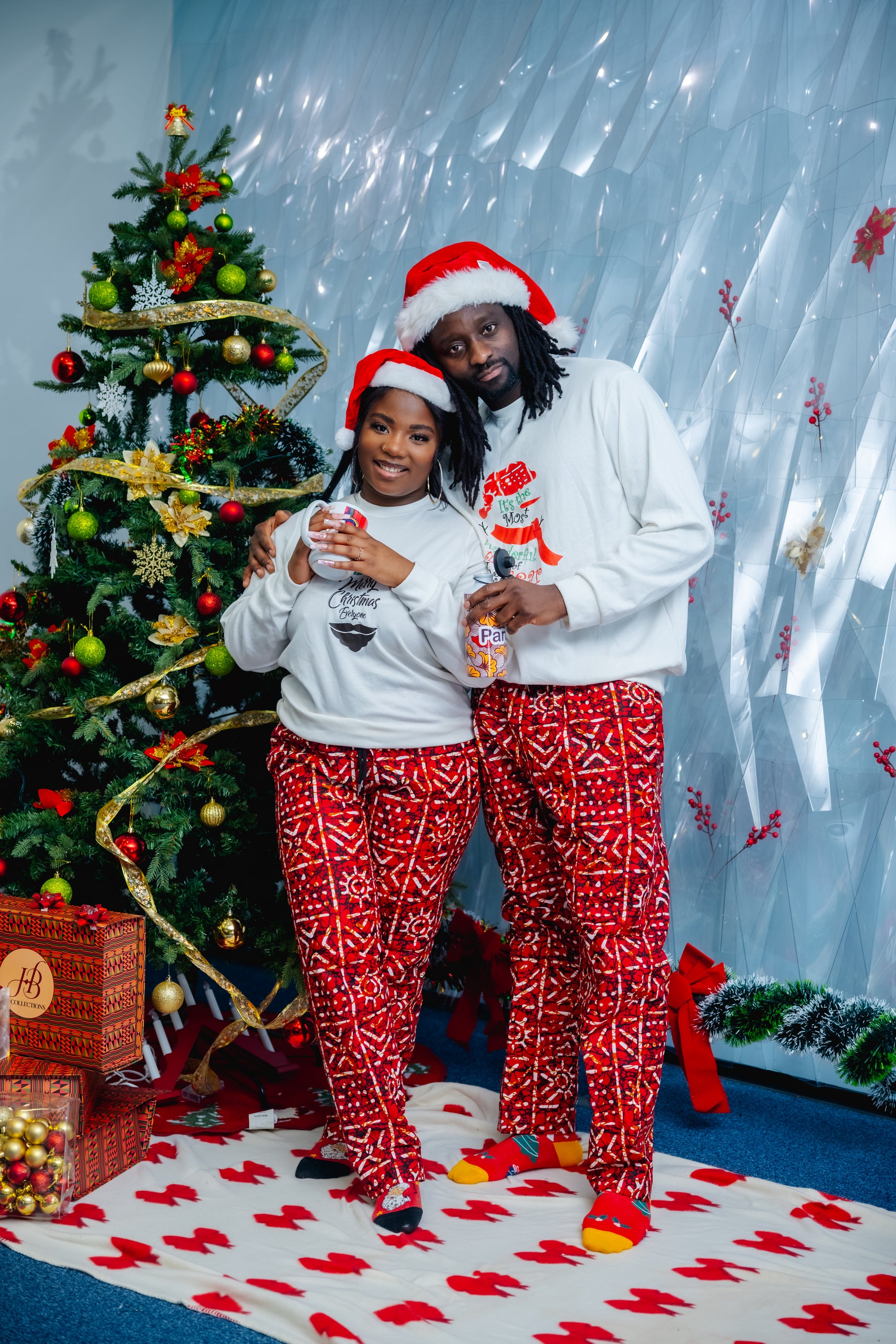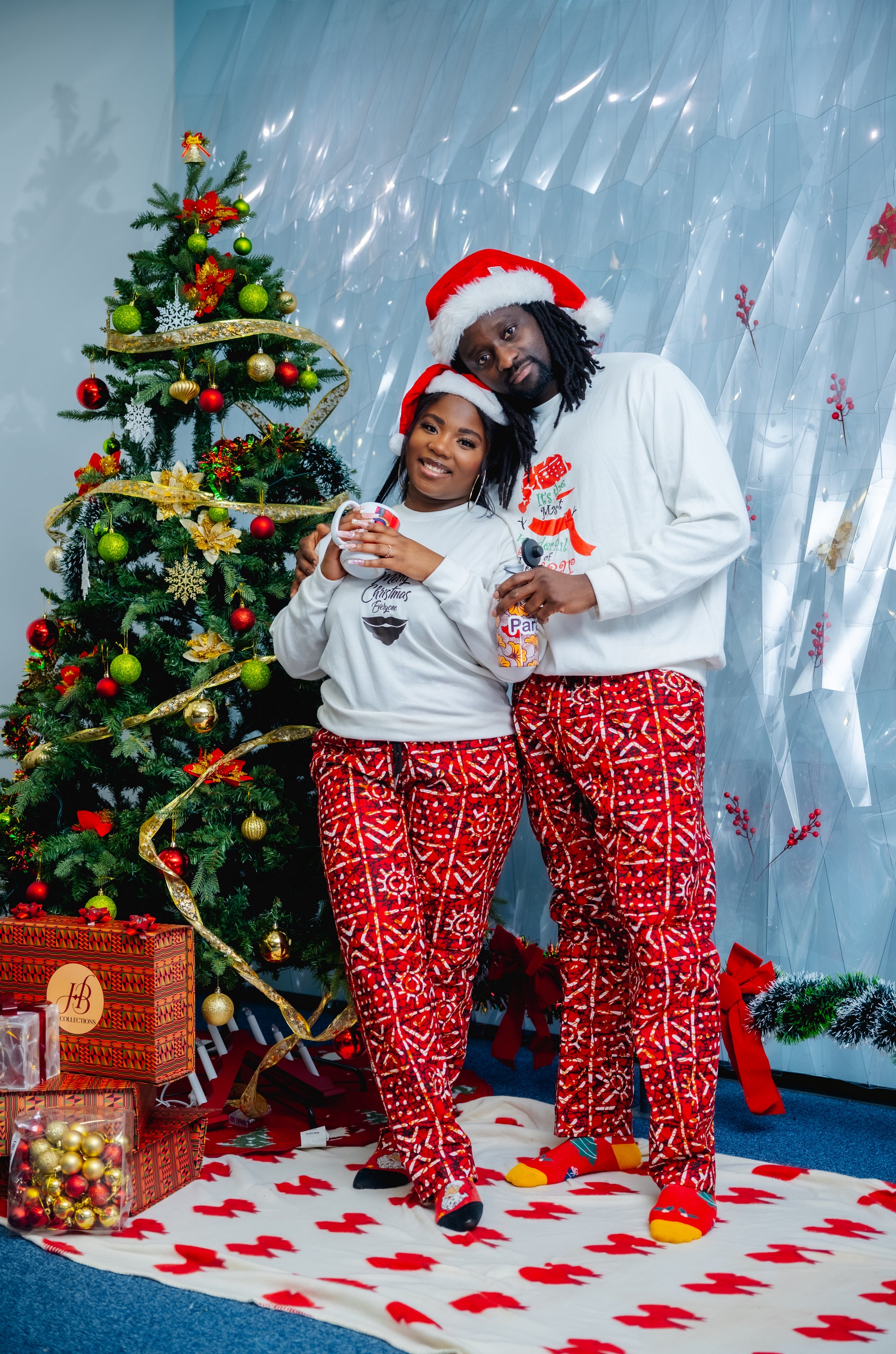 Stay festive and stylish all year round with our HBC sweater and pants set. Featuring a jolly Christmas sweater and tribal print trousers, this unisex set is perfect for the holiday season and beyond. Available in green and red, you'll be sure to stand out in any setting. Plus, the versatile pants can be worn anytime. Choose your size and color, and check our size chart for the perfect fit.