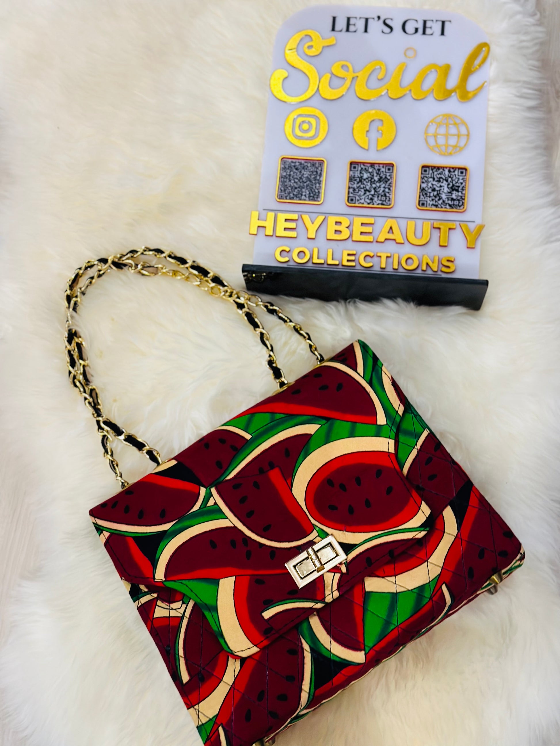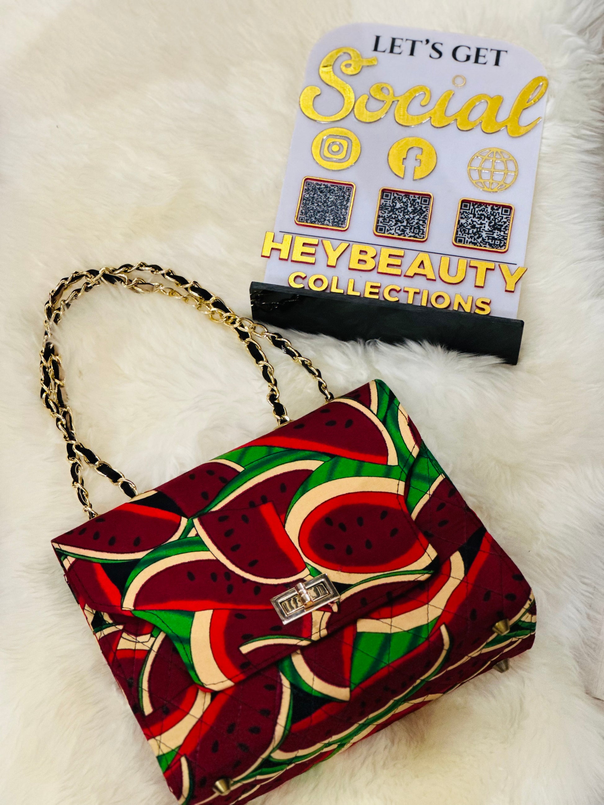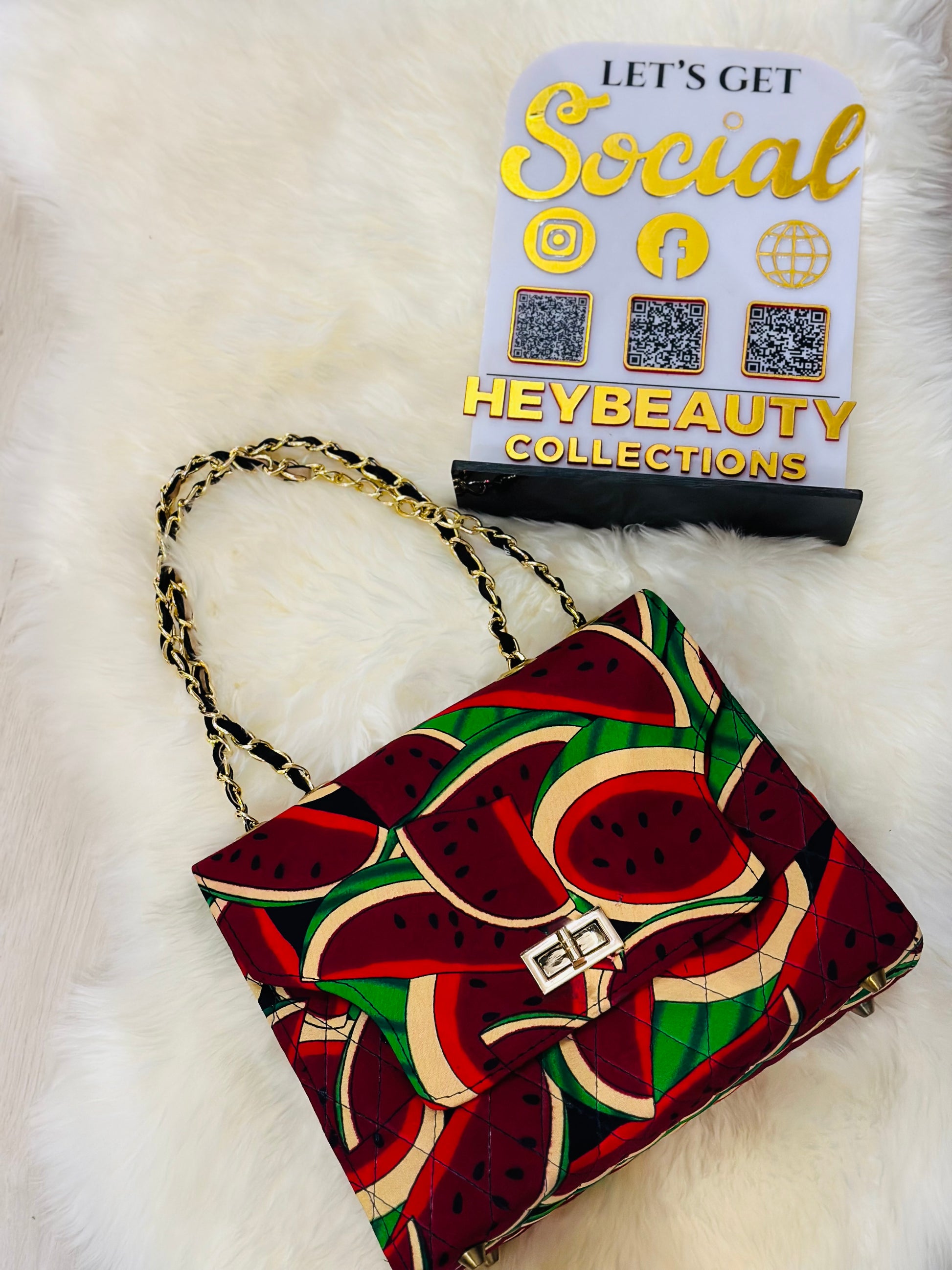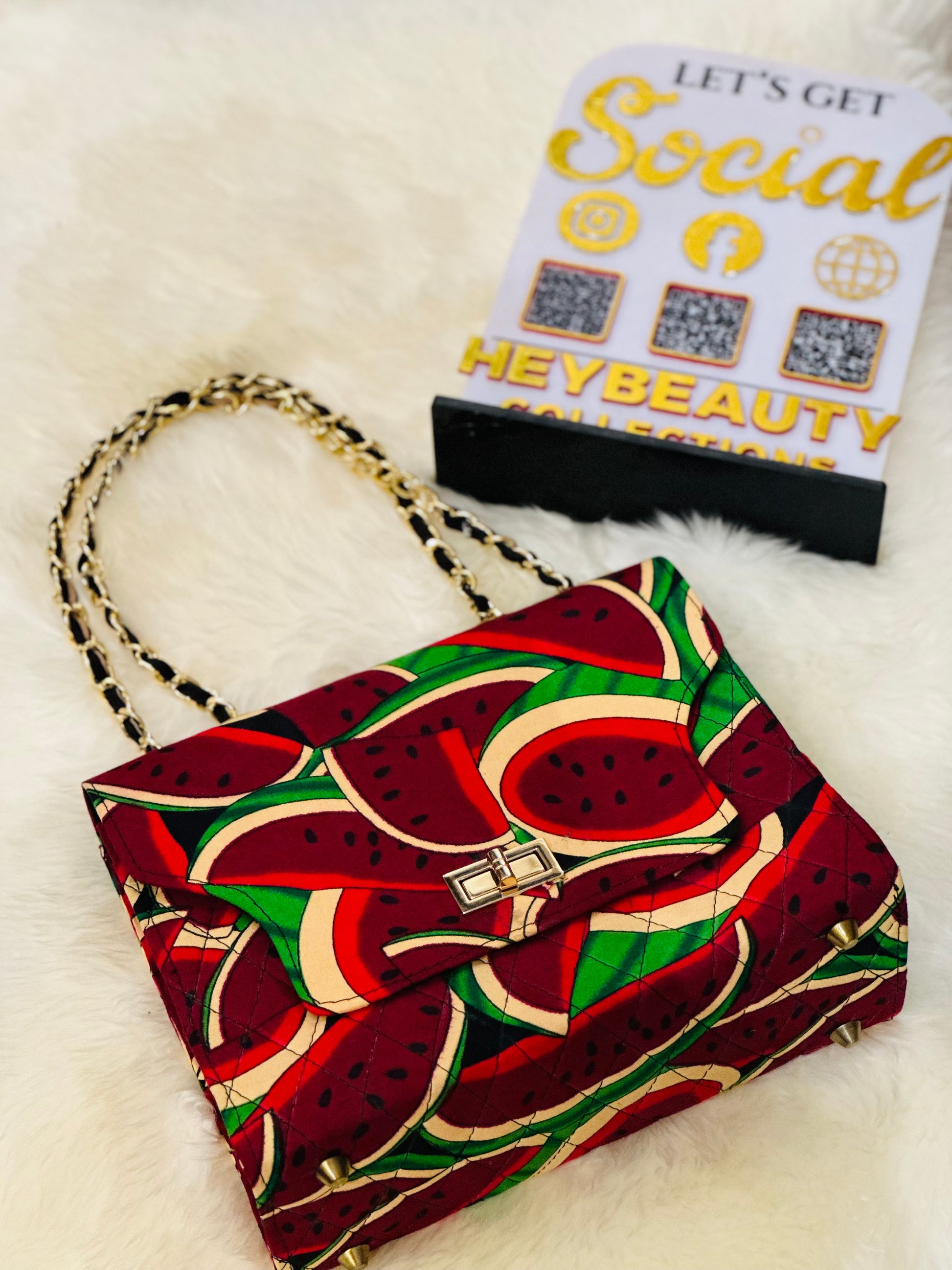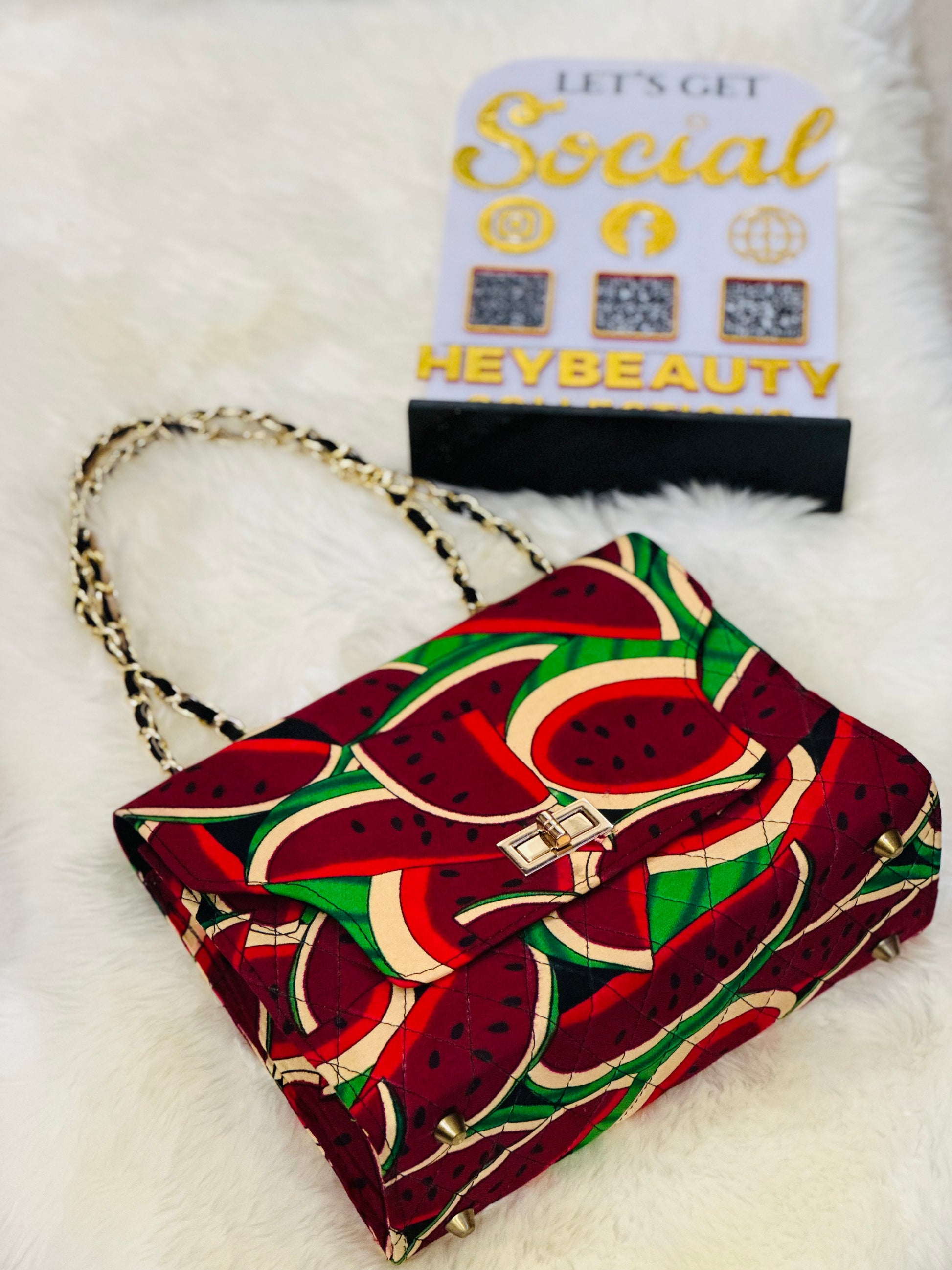 This MARIE LAUKKU bag features a vibrant African watermelon print with convenient strings for easy carrying. With ample space, it can fit all your essentials. Perfect for adding a touch of color and functionality to your wardrobe.