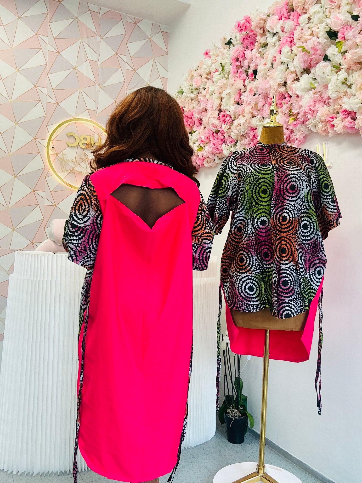 The lower part of the dress transitions into a solid hot pink fabric, forming a dramatic high-low hemline that adds movement and a contemporary twist. The sides of the dress are detailed with long drawstring ties, allowing for adjustable styling and a flattering fit.