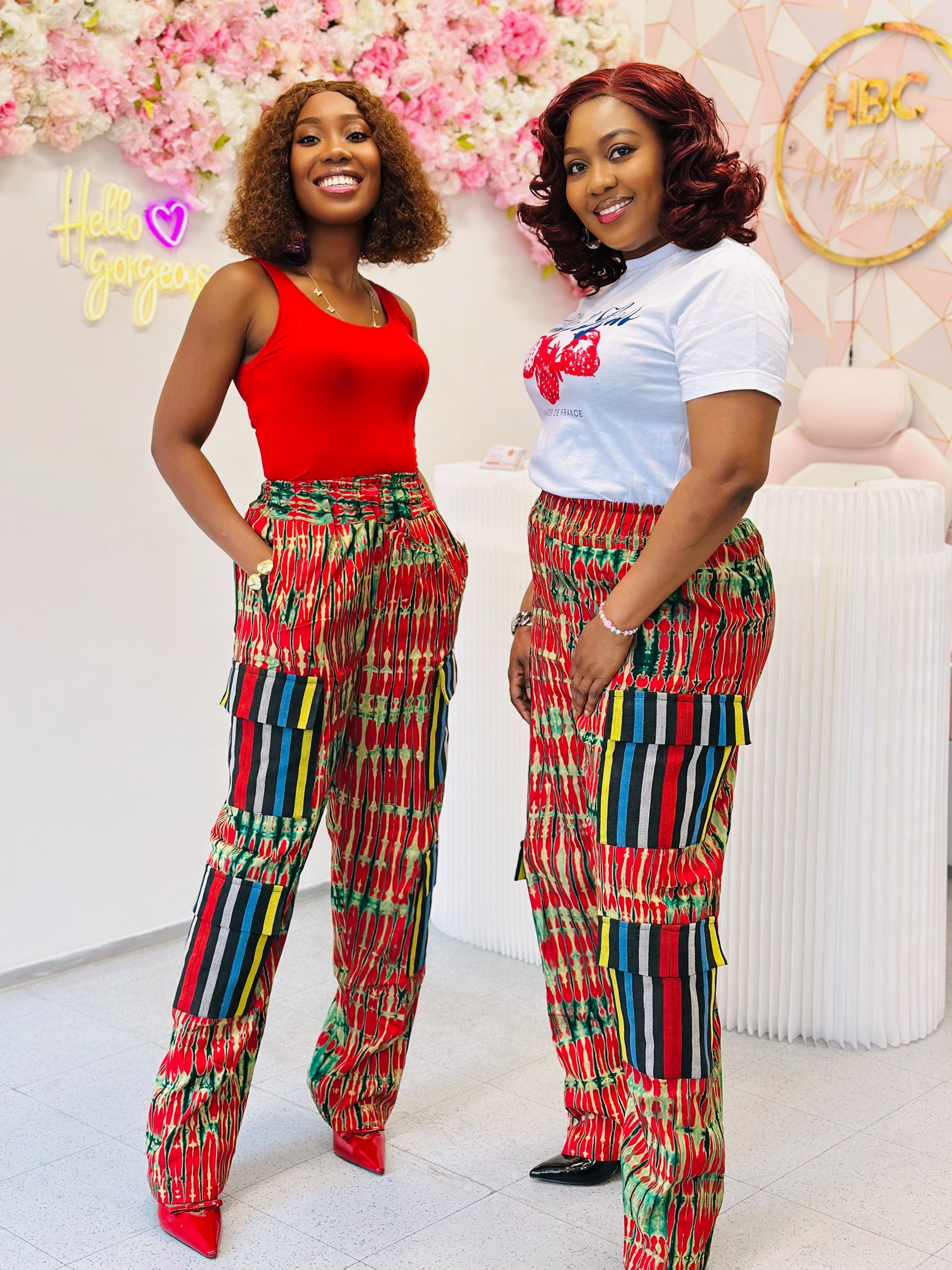 This vibrant African outfit is a bold and stylish celebration of culture and modern fashion. The standout piece is the pair of high-waisted, multi-pocket cargo pants made from Ankara fabric. The fabric features a striking mix of vertical black, red, green, and yellow stripes interwoven with abstract red and green patterns, creating a dynamic visual contrast. The pants are tailored with a ruched, layered effect that adds texture and movement.