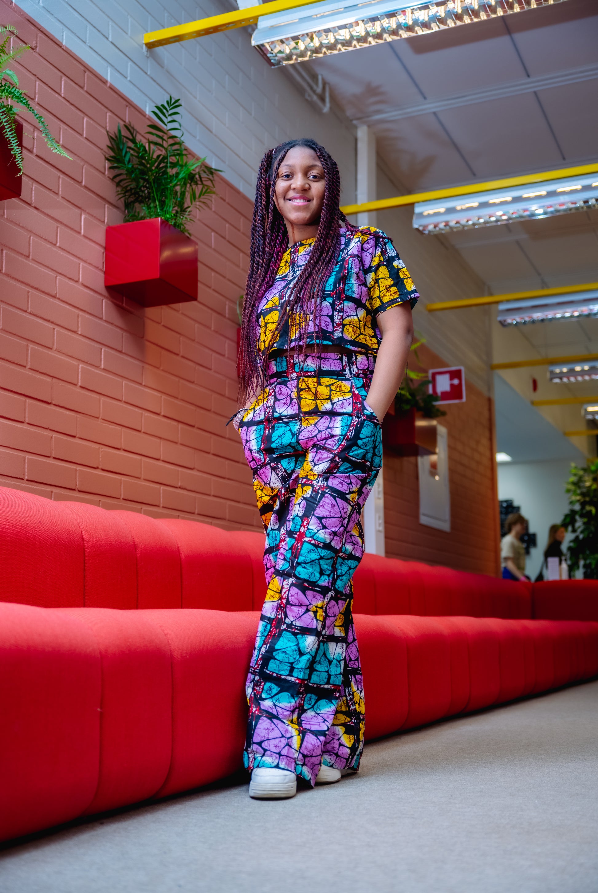 TONES two piece set features a striking African print on soft cotton fabric. The crop top and wide leg pants create a stylish and comfortable outfit that is perfect for any occasion. Made from vibrant African fabric, this set embraces bold colors and patterns for a unique and statement-making look. Elevate your wardrobe with this eye-catching set.
