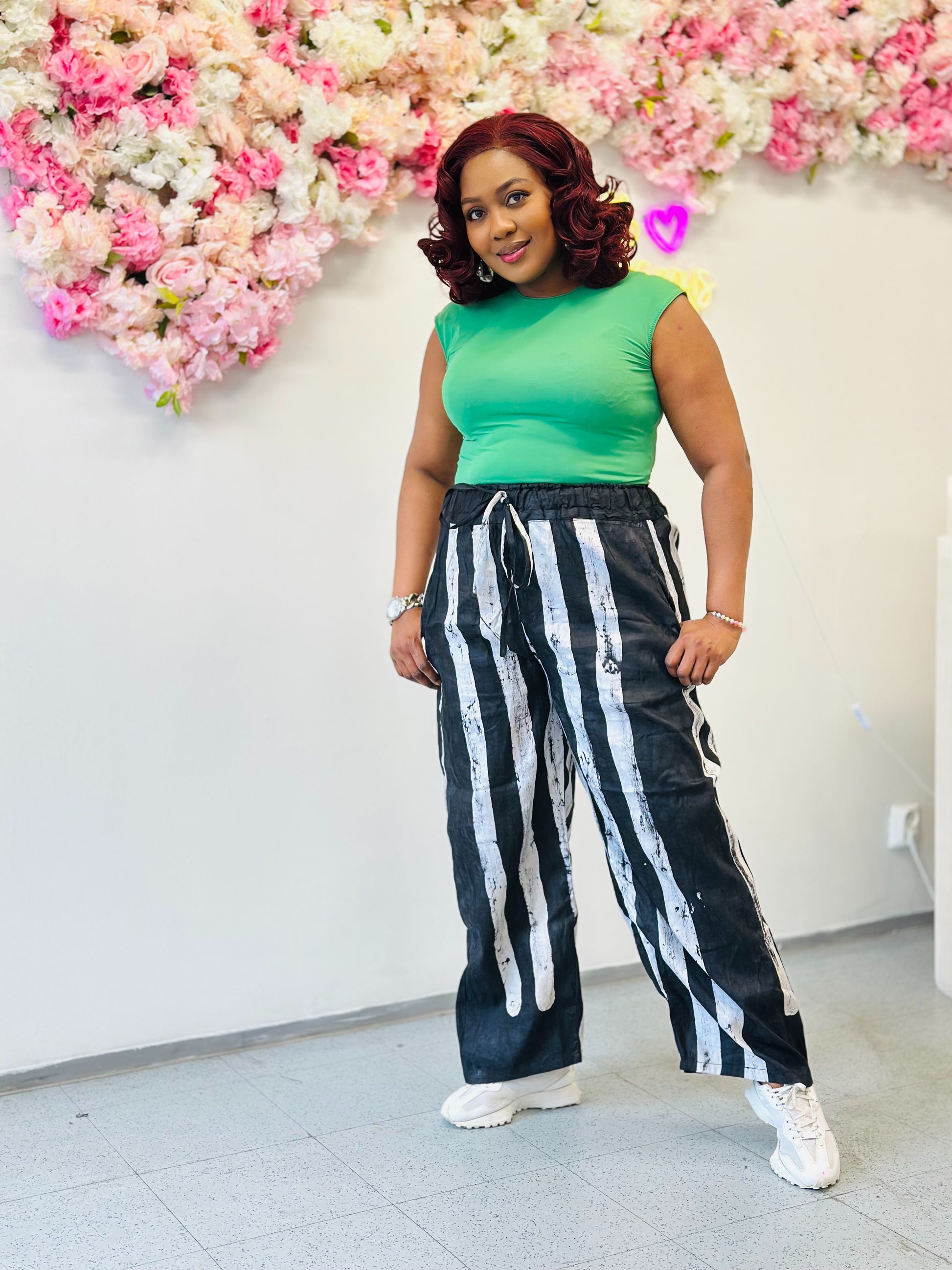 Turn heads with these bold wide-leg trousers featuring striking vertical black-and-white painted stripes. Designed with a relaxed fit and a comfortable drawstring waist, they offer both effortless style and all-day comfort. Perfect for pairing with a fitted top or a casual tee, these trousers bring a modern artistic edge to any outfit.